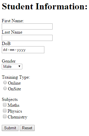 We will create following Student Information form with submit and reset functionality.