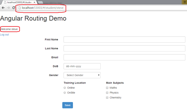 - Define studentController which attaches username property to $scope, to display user name in the view. Notice that $routeParams is used to get the value of url parameter supplied from login view.