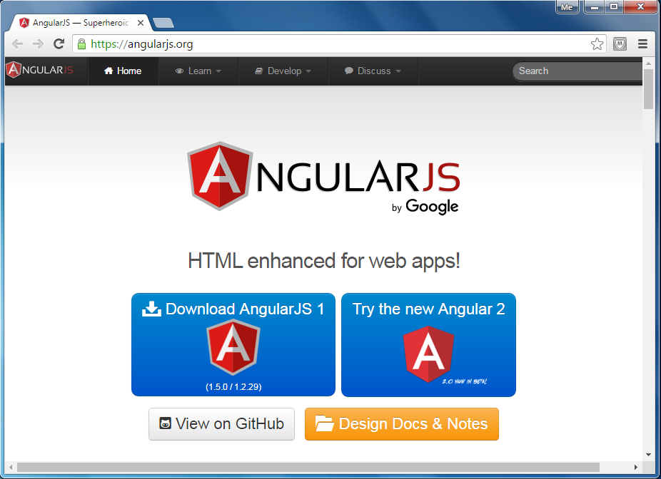 As you can see in the above angularjs.org website, you can download AngularJS 1 library by clicking on the Download AngularJS 1 link. AngularJS 2 is in the beta version as of this writing. This tutorials is using AngularJS 1.