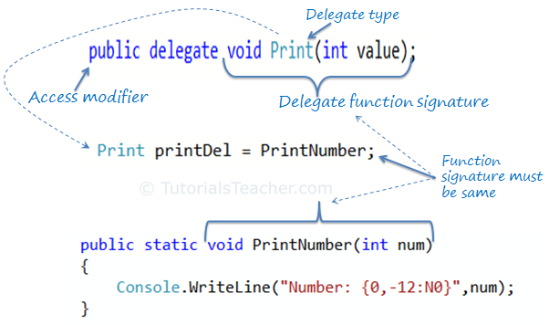 The Print delegate shown above, can be used to point to any method that has same return type & parameters declared with Print. Consider the following example that declares and uses Print delegate.