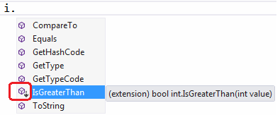 In the following example, IsGreaterThan() is an extension method for int type, which returns true if the value of the int variable is greater than the supplied integer parameter.