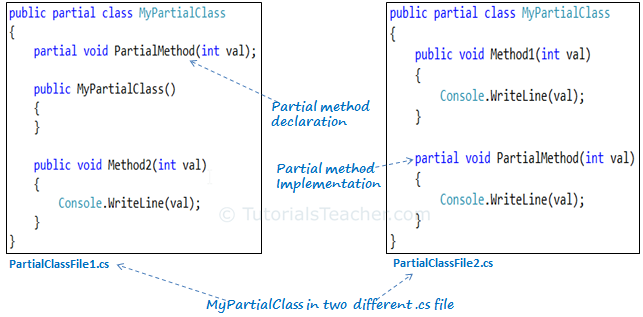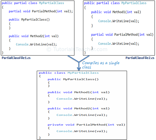 MyPartialClass in PartialClassFile1.cs defines the constructor and one public method, Method1, whereas PartialClassFile2 has only one public method, Method2. The compiler combines these two partial classes into one class as below: