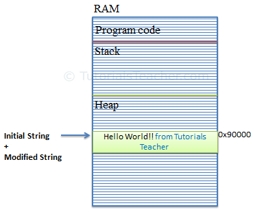 A String is immutable, meaning String cannot be changed once created. For example, new string "Hello World!!" will occupy a memory space on the heap. Now, by changing the initial string "Hello World!!" to "Hello World!! from Tutorials Teacher" will create a new string object on the memory heap instead of modifying the initial string at the same memory address. This behaviour will hinder the performance if the same string changes multiple times by replacing, appending, removing or inserting new strings in the initial string.