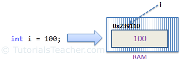 The system stores 100 in the memory space allocated for the variable 'i'. The following image illustrates how 100 is stored at some hypothetical location in the memory (0x239110) for 'i':