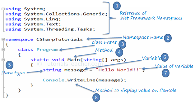 - Every .NET application takes the reference of the necessary .NET framework namespaces that it is planning to use with the "using" keyword e.g.
