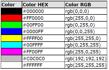 Colors are defined using a hexadecimal notation for the combination of red, green, and blue color values (RGB). The lowest value that can be given to one light source is 0 (hex #00). The highest value is 255 (hex #FF). This table shows the result of combining red, green, and blue: