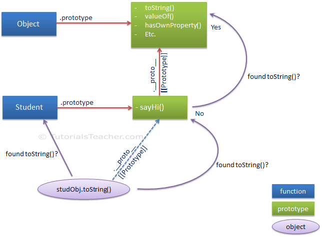 If it still cannot find it there then it goes up in the heirarchy and check prototype object of Object function because all the objects are derived from Object in JavaScript, and look for toString() method. Thus, it finds toString() method in the prototype object of Object function and so we can call studObj.toString().