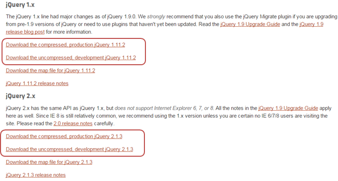 Here, you can download two versions of jQuery library v1.x and v2.x. If you need to support Internet explorer 6 to 8 then download v1.x. To support modern browser and IE 9+ download v2.x.