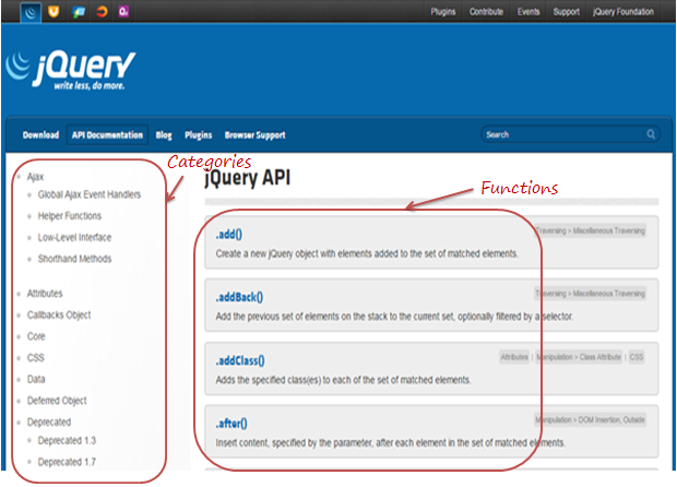 As you can see above, categories of jQuery features are listed on the left side. Right-hand section shows functions related to the currently selected category. Click on a function to get detailed information with example.