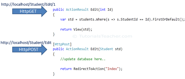 You can also apply multiple http verbs using AcceptVerbs attribute. GetAndPostAction method supports both, GET and POST ActionVerbs in the following example: