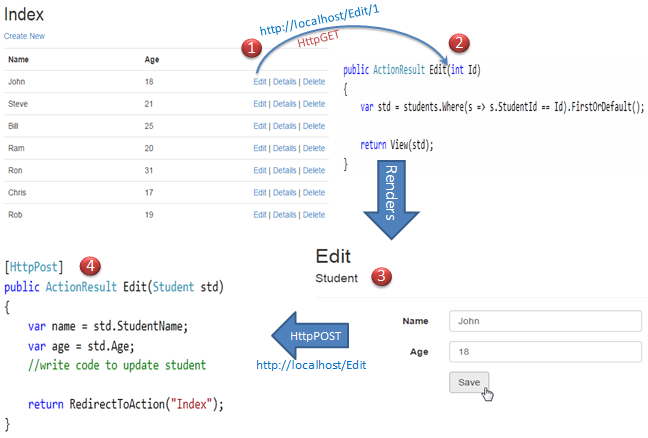 1. The user clicks on the Edit link in Index view which will send HttpGET request http://localhost/student/edit/{Id} with corresponding Id parameter in the query string. This request will be handled by HttpGET Edit action method.(by default action method handles HttpGET request if no attribute specified)