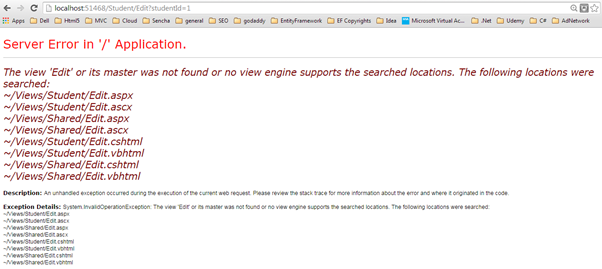 The above error occurred because we have not created an Edit view yet. By default, MVC framework will look for Edit.cshtml or Edit.vbhtml or Edit.aspx or Edipt.ascx file in View -> Student or Shared folder.