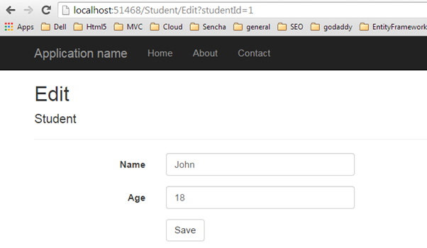 Now, click on the Edit link of any student in the Index view. Edit view will be display student information whose Edit link clicked, as shown below.