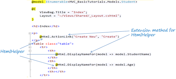 As you can see in the above figure, @Html is an object of HtmlHelper class . (@ symbol is used to access server side object in razor syntax). Html is a property of type HtmlHelper included in base class of razor view WebViewPage. ActionLink() and DisplayNameFor() is extension methods included in HtmlHelper class.