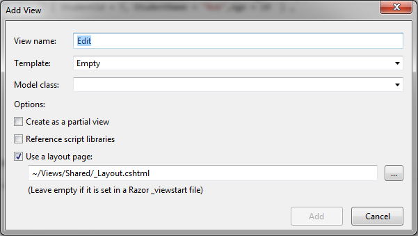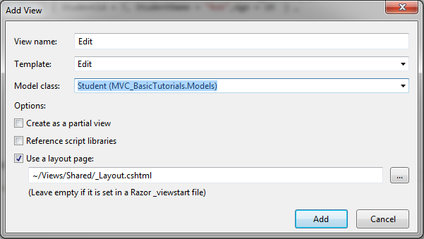 Now, click Add to generate Edit view under View/Student folder. Edit.cshtml will be generated as shown below.