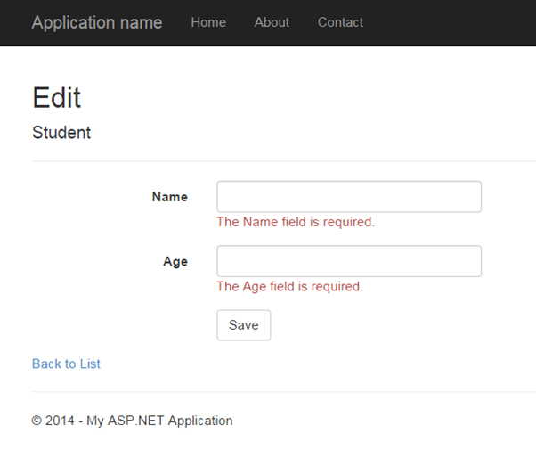 We have created an Edit view for Student in the previous section. Now, we will implement data validation in the Edit view, which will display validation messages on the click of Save button, as shown below if Student Name or Age is blank.