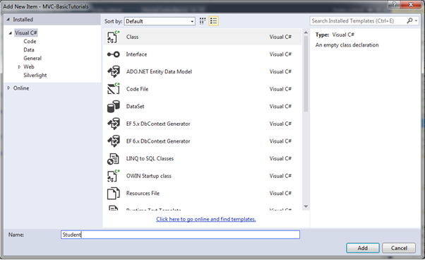 Open our first MVC project created in previous step in the Visual Studio. Right click on Model folder -> Add -> click on Class..