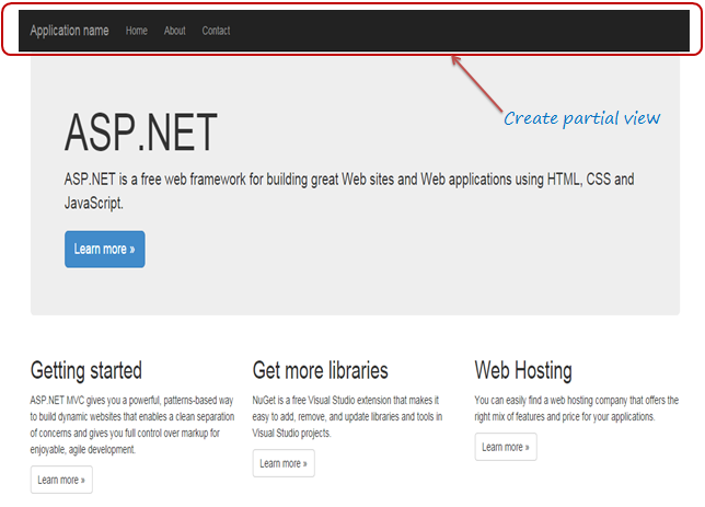 To start with, let's create a simple partial view for the following navigation bar for demo purposes. We will create a partial view for it, so that we can use the same navigation bar in multiple layout views without rewriting the same code everywhere.