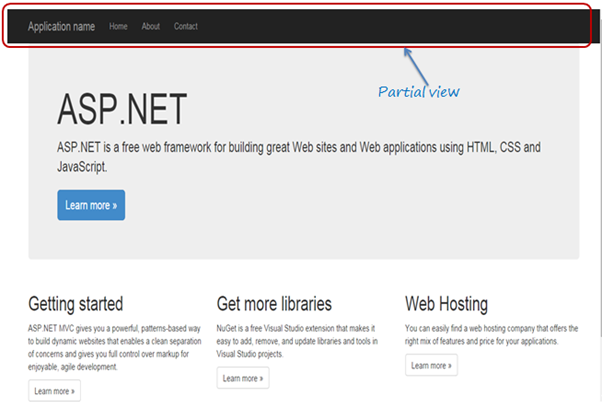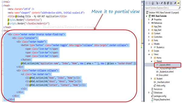 So now, we can use any of the above rending methods to render the _HeaderNavBar partial view into _Layout.cshtml. The following layout view renders partial view using the RenderPartial() method.