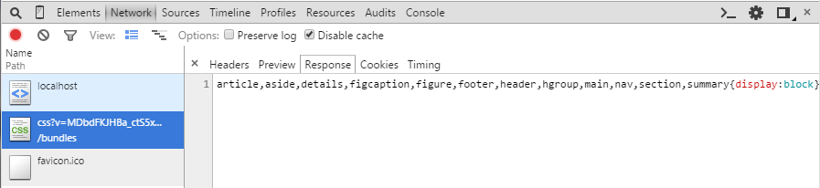 As shown in the above example, use Styles.Render() method to include specified css bundle at runtime. Open developer tool of the browser and check that it has minified and loaded css files as shown below.