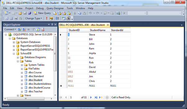 After installing the driver, we are ready to access MS SQL server database. We will connect to a local SQLExpress database server and fetch all the records from Student table in SchoolDB database shown below.