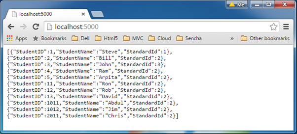 Run the above example using node server.js command and point your browser to http://localhost:5000 which displays an array of all students from Student table.