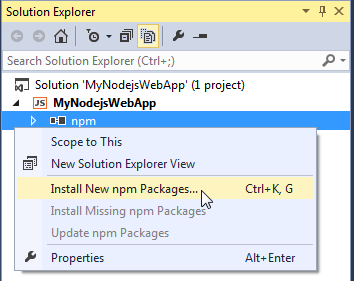 In the node.js web app, we created a simple node.js web application in Visual Studio. Now, to install Express.js, right click on the project MyNodejsWebApp -> select Install New npm Packages.