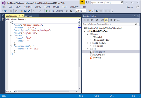 So, this will install express.js package into your project under node_modules folder. It also adds a dependencies entry for express.js as shown below.