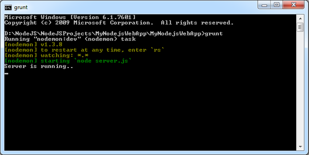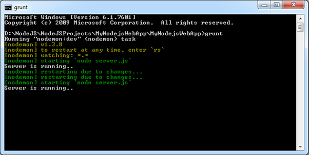 In the above example, we have specified nodemon task in the grunt.initConfig() method for restarting the Node.js server whenever any JavaScript file changes in your project. At the end, loadNpmTasks() method loads the specified plugin which is grunt-nodemon in this case. The registerTask() method registers the default task to run whenever gruntjs starts.