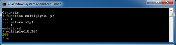 To launch the REPL (Node shell), open command prompt (in Windows) or terminal (in Mac or UNIX/Linux) and type node as shown below. It will change the prompt to > in Windows and MAC.