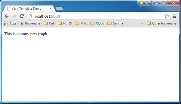 As you can see, we have specified an object with title and content properties in the res.render() method while rendering index.vash. Now, run the above application using node server.js command and point your browser to http://localhost:5000 and you will get the following result.