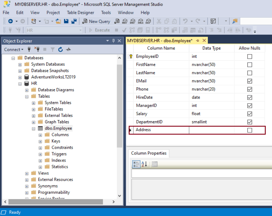 The following adds a new column Address of type varchar and size 500 column to the Employee table.