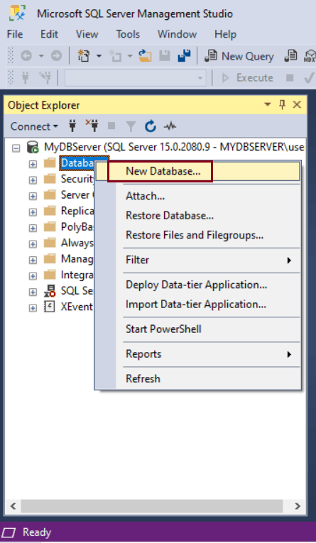 Open SSMS and in Object Explorer, connect to the SQL Server instance. Expand the database server instance where you want to create a database.