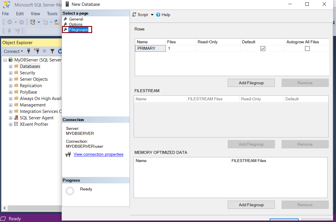 Now, select Filegroups tab. Filegroups are the physical files on your disc, where SQL server data is stored. By default a Primary data file is created while creating a new database. Learn more about Files and Filegroups.
