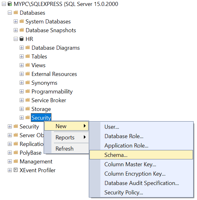 Step 3: Right-click on the Security folder and select New -> Schema, as shown below.