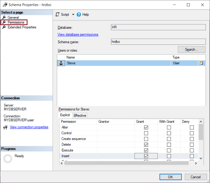 Database Schema in SQL Server Step 4: Click on the Permissions page to see the lists of all the securables and the permissions on those securables that can be granted, as shown below.