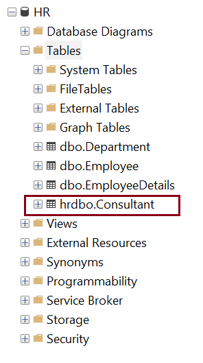The above will create a new table Consultant in the hrdbo schema, as shown below.
