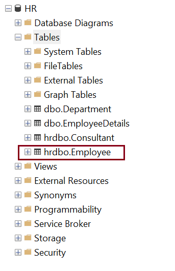 The above will create a new schema hrdbo. You can see this in SSMS under Security -> Schemas folder, as shown below.