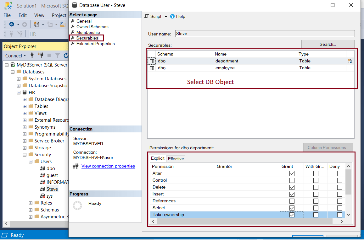 Login to SQL Server Management Studio. In Object Explorer on the left pane, expand the Databases folder and select the concerned database and navigate to the by expanding Security and Users folders. Right-click the User to which you want to GRANT or REVOKE the permissions. Here, we will GRANT permissions to our new user 'Steve'. So right-click on a user Steve and click Properties, as shown below.