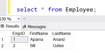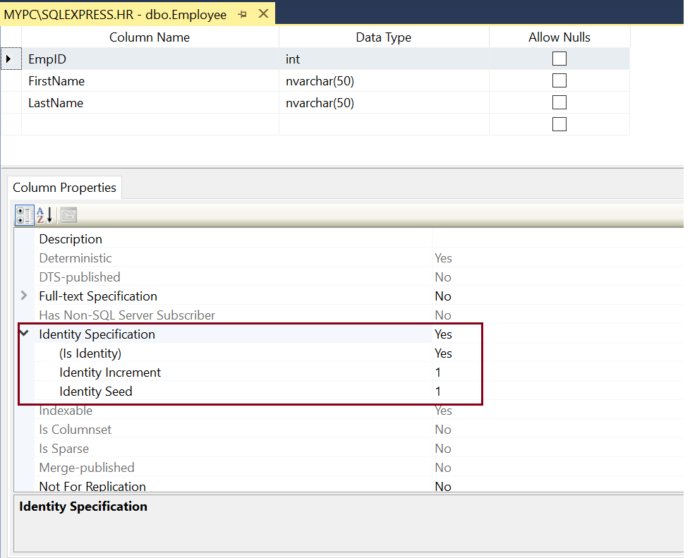 CREATE TABLE Employee( [EmpID] [int] IDENTITY(1,1) NOT NULL, [FirstName] [nvarchar](50) NOT NULL, [LastName] [nvarchar](50) NOT NULL);