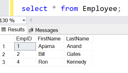 The above statement will insert a row where the EmpID value will be 4 and not 3, as shown below. Thus, even if an error occurred in the transaction, the identity column value will still be increased.