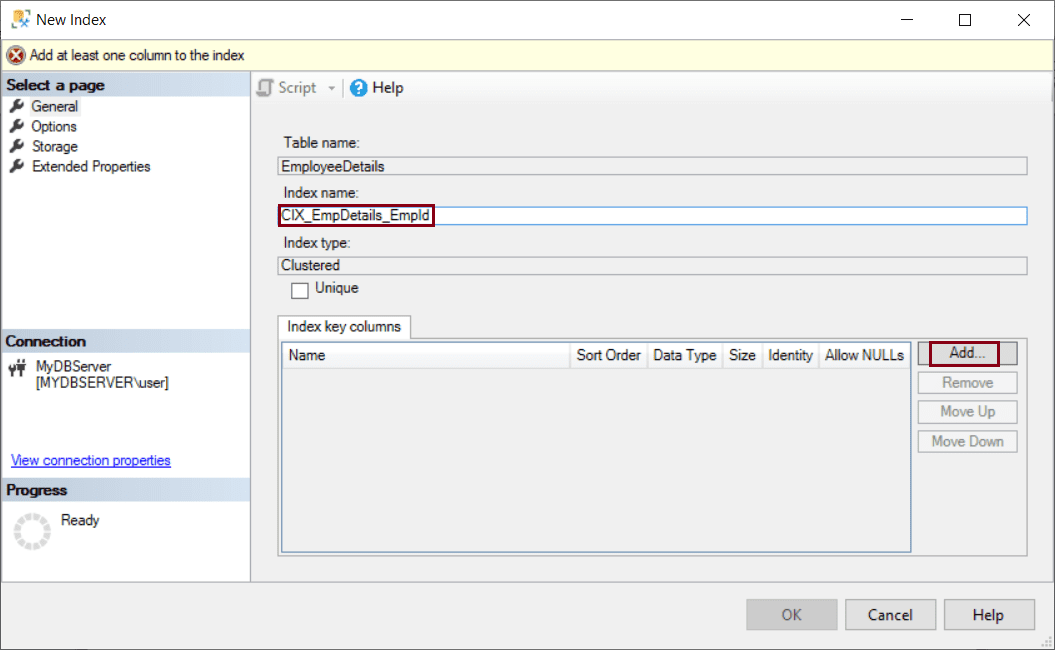 Step 3: In the New Index dialog box, on the General page, enter a name of an index under the Index Name and click on the Add button under the Index Key Columns, as shown below.