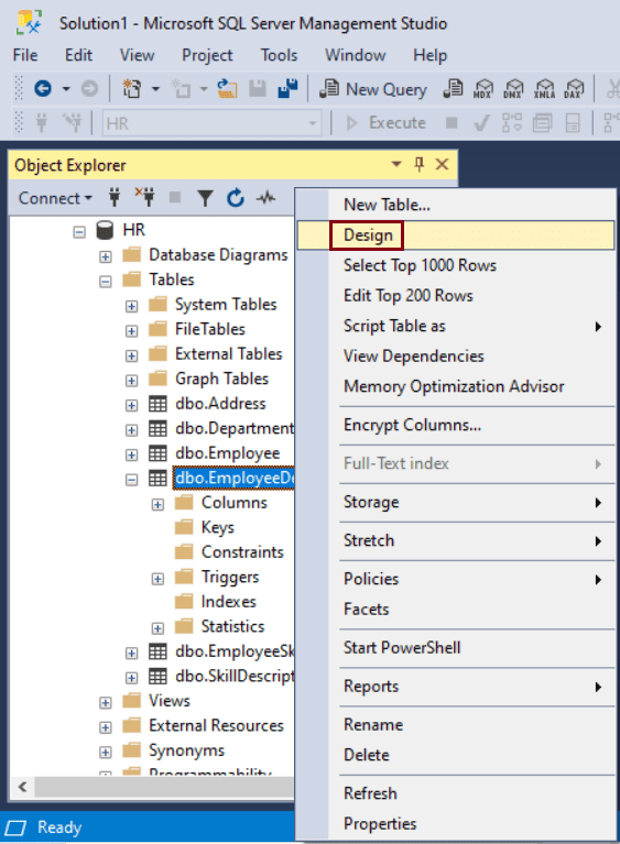 Step 1: In the Object Explorer, right-click on the table where you want to create a clustered index and click Design.
