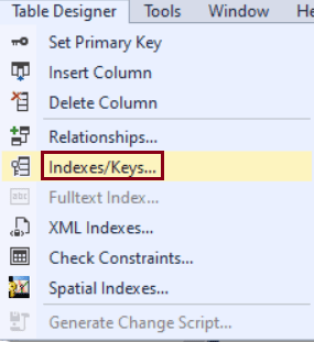 Step 2: On the Table Designer menu, click on Indexes/Keys.