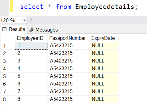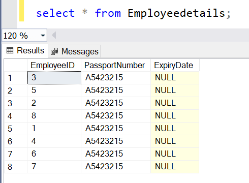 The data in the EmployeeDetails table are not stored in any order. Execute the Select * from EmployeeDetails; and you will see the following result.