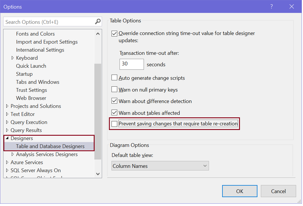 Save the changes by pressing Ctrl + s. If it prevents saving and display a message to re-create a table, then go to Tools menu, click Options, expand Designers, and then click Table and Database Designers. Clear the Prevent saving changes that require the table to be re-created check box, as shown below.