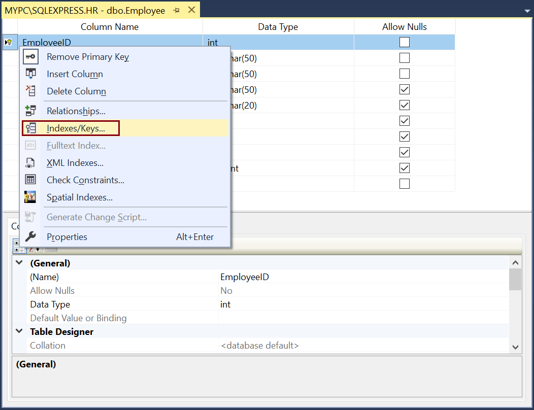 Now, right-click in the table designer and choose Indexes/Keys from the menu, as shown below.