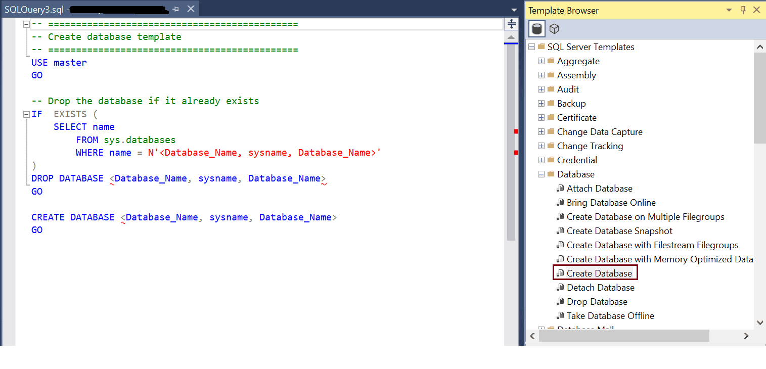 Open Template Explorer from View menu -> Template Explorer. The following displays Create Database template.