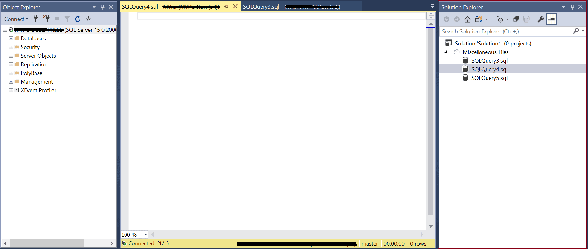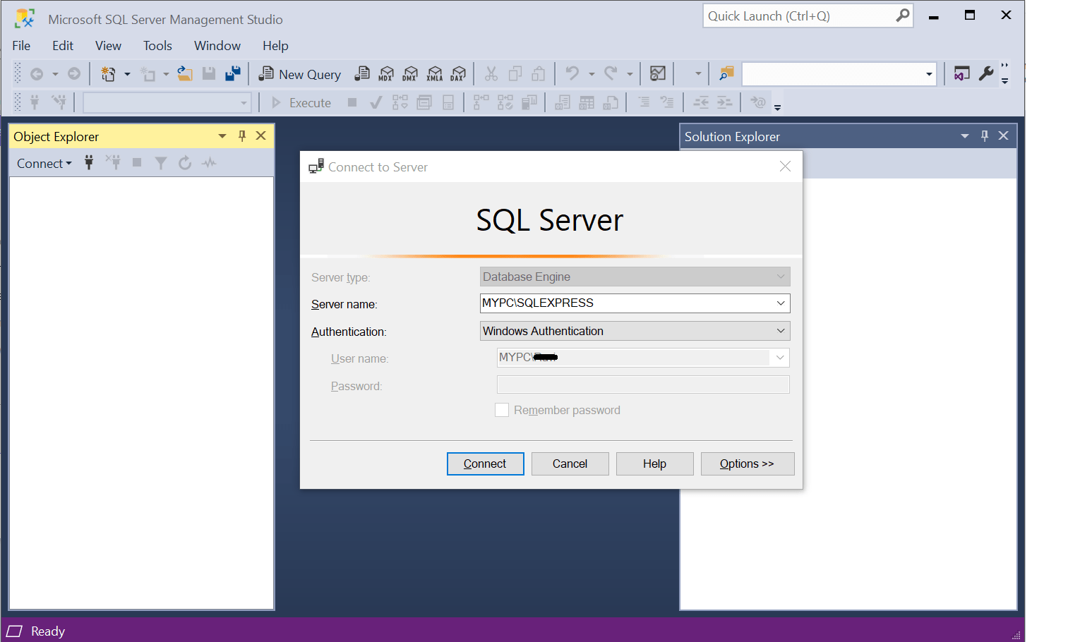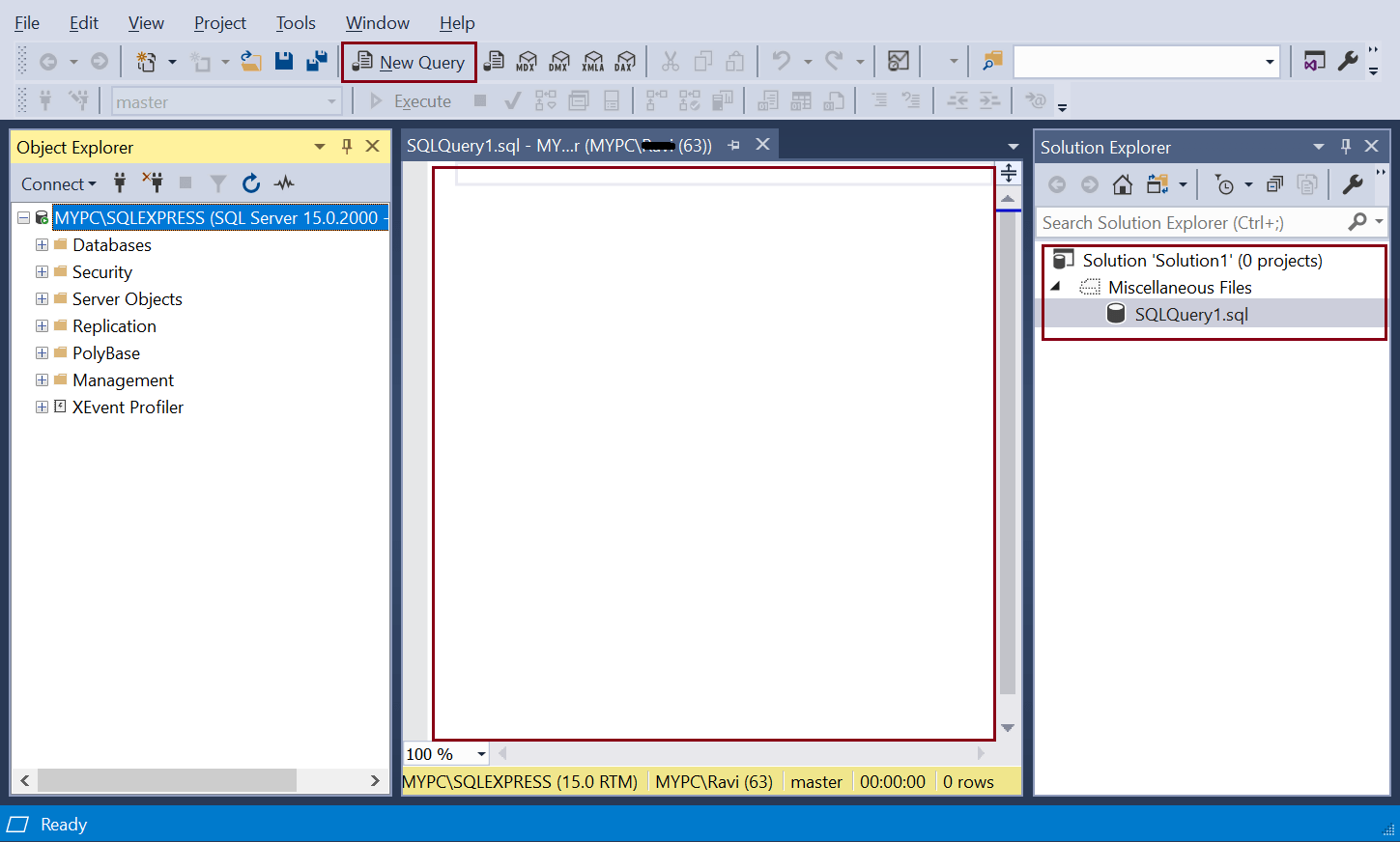On successful login, the SSMS opens the following window.