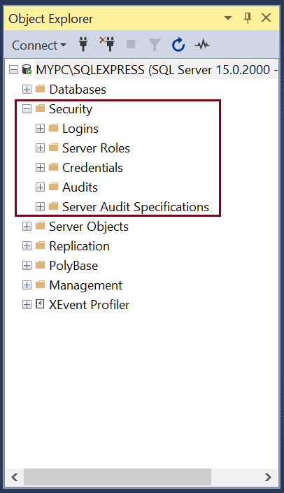 Object Explorer contains different components of one or more instances of SQL Server in a hierarchical manner. You can view and manage components such as Databases, Security, Server Objects, Replication, Polybase, Management, etc. Expand the component node to see further objects.